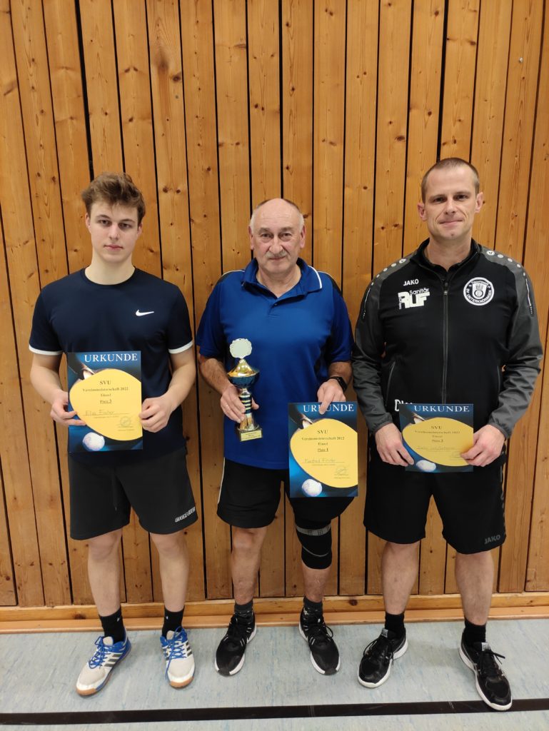 Bei den Einzelvereinsmeisterschaft der Herren 2022, die am Mittwoch, den 21.12.2022 ab 20:00 Uhr im Modus „Gruppen mit anschließender KO-Runde“ ausgetragen wurde, resultierten in einem 10 Mann starken Spielerfeld nach Ausspielen von 2 5er-Gruppen gefolgt von Halbfinale und Finale (sowie Platzierungsspielen) folgende Ergebnisse: Platz 10: Walter Czech Platz 9: Petar Nahirni Platz 8: Rainer Frodl Platz 7: Josef Abold Platz 6: Thomas Schretzenmaier Platz 5: Andreas Meissner Platz 4: Stephan Meissner Platz 3: Elias Fischer Platz 2: Dieter Weißenhorner Platz 1: Manfred Findler Manfred Findler gelang damit das Kunststück sowohl Einzel- als auch Doppelvereinsmeister der Herren 2022 zu werden. Dabei sah es am Ende der Gruppenphase schon nach einem Ausccheiden in der Gruppenphase aus. Im entscheidenden Spiel konnte Manfred Findler nach 0:2 Satzrückstand und Matchballen gegen sich das Blatt gegen Andreas Meissner noch wenden und durch einen hochdünnen 3:2 Erfolg den Halbfinaleinzug äußerst knapp sichern. IIn den anschließenden KO-Spielen gegen den ausgepowerten Elias Fischer im Halbfinale und gegen Dieter Weißenhorner im Finale musste Manfred Findler dann keinen Satz mehr abgeben.