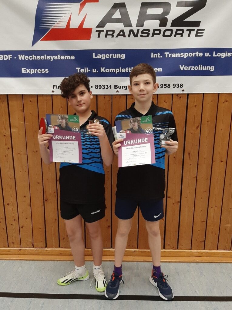 Emir Efe (links) sicherte sich beim Tischtennis – Bezirksentscheid der Minis den Titel bei den Jungen 9-10 Jahre den Titel. Mit drei 3:0 Erfolgen setzte er sich in seiner Gruppe souverän durch und konnte im Viertelfinale einen 0:2 Satzrückstand noch in einen 3:2 Erfolg umbiegen. Durch seinen unbedingten Siegeswillen setzte er sich auch im Halbfinale nach 1:2 Rückstand schließlich mit 3:2 durch ehe er im Finale mit einem 3:1 Erfolg gegen Samuel Safak aus Gessertshausen die Qualifikation perfekt machte. Bei den Jungen 11-12 Jahre ging Maxim Kusin (im Bild rechts) an die Platten. Auch er setzte sich mit klaren Erfolgen in der Vorrunde als erster durch und erreichte mit einem 3:1 Sieg im Viertelfinale und einem glatten 3:0 Erfolg im Halbfinale, das Endspiel. Hier musste er sich nach sehr guter Leistung jedoch dem Nördlinger Nachwuchstalent Noah Vescera mit 1:3 geschlagen geben und muss somit auf einen freien Platz in der Bayerischen Endrunde hoffen.